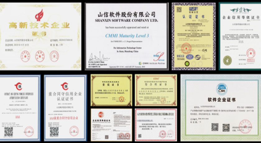 山(shān)信軟件現有(yǒu)職工1168人(rén),中高(gāo)級職稱占比65%。獲得(de)了37項省部級和(hé)260餘項地廳級科技(jì)成果、發明(míng)和(hé)實用新型專利 106 項、軟件著作(zuò)權 105 項、 軟件産品 64 項;通(tōng)過了CMMI三級、QES、IDC、ITSS認證;取得(de)了信息系統集成、兩化融合管理(lǐ)體(tǐ)系貫标咨詢服務、安防工程設計(jì)施工、建築智能化系統設計(jì)、電(diàn)子系統工程設計(jì)、電(diàn)子與智能化工程承包等專業資質。